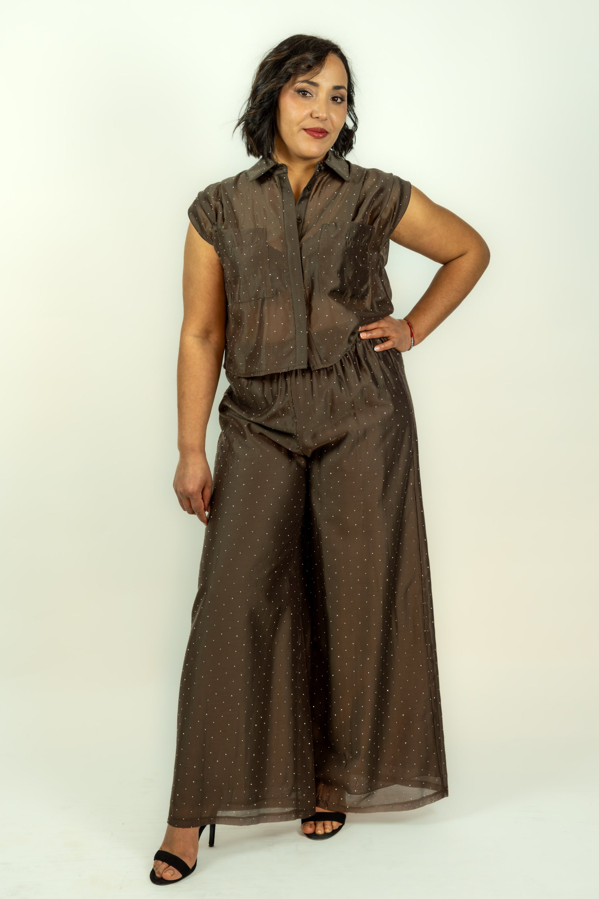 Camicia in tessuto pregiato con paillettes applicate che catturano la luce, perfetta per creare look sofisticati e luminosi. La tonalità marrone neutro si abbina facilmente a qualsiasi outfit, mentre i dettagli scintillanti aggiungono un tocco di eleganza contemporanea. Ideale per occasioni speciali, serate e momenti in cui desideri fare un'impressione. Realizzata con attenzione ai dettagli, combina comfort e stile in un'unica proposta versatile.